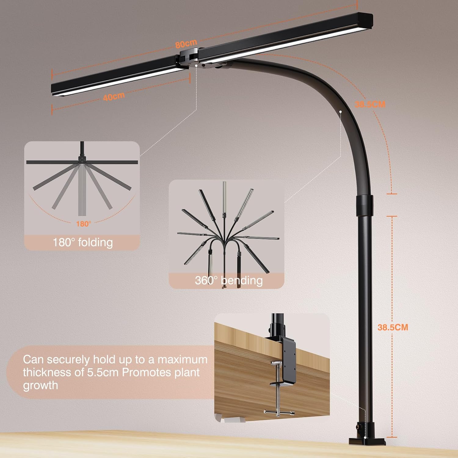 【Double tête large de 80 cm et lumière ultra-lumineuse de 1300 lm】Comparée à des lampes de bureau similaires sur le marché, notre lampe à lumière du jour dimmable dispose de deux bras de lampe qui peuvent être déployés jusqu’à une largeur de 80 cm. Elle offre un éclairage plus large et plus lumineux pour les grandes stations de travail, les écrans incurvés ou les doubles moniteurs, afin que vous puissiez vous concentrer sur votre espace de travail.