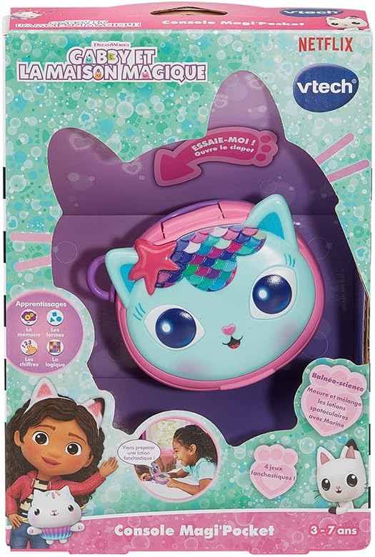 LA VERSION FRANÇAISE de cette console de jeux portable permet aux enfants dès 3 ans d’expérimenter la Balnéo-science avec le personnage mi-chat mi-sirène, Marine, de Gabby et la maison magique !