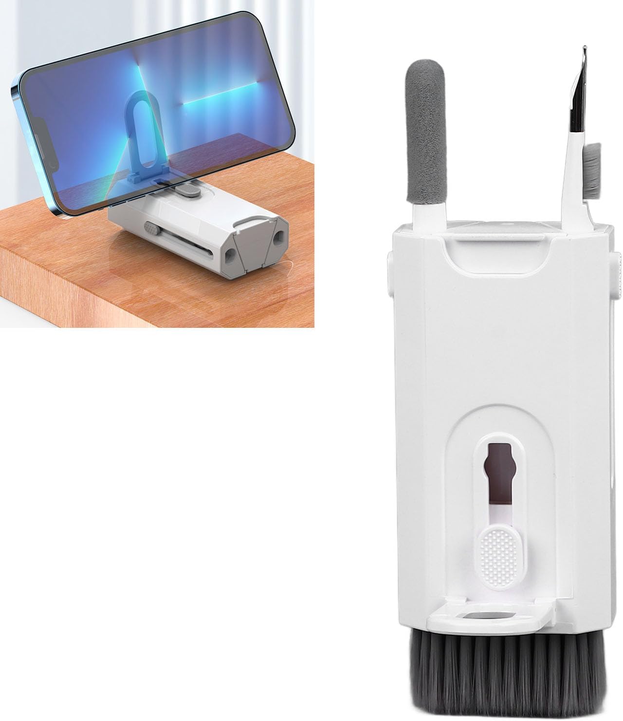 8 in 1 – Keyboard kit with pads, tips, high-density soft bristles, phone holder, brushes, screen cleaning spray nozzle, washable fiber flannel and key puller.