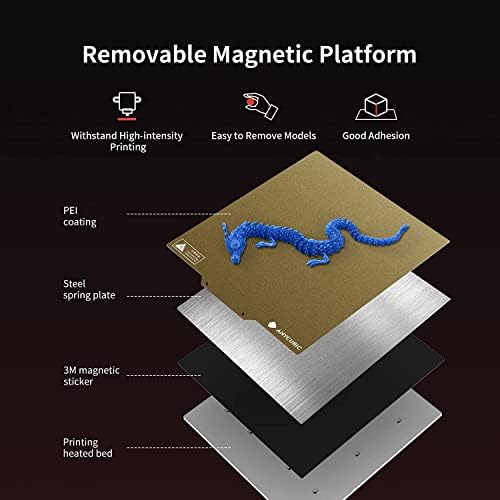Plateforme magnétique amovible : les modèles peuvent être retirés en pliant doucement la plate-forme magnétique à ressort après l’impression. La plate-forme peut résister à une impression à haute intensité et est sans corrosion, ce qui vous permet d’économiser beaucoup de coûts de maintenance.