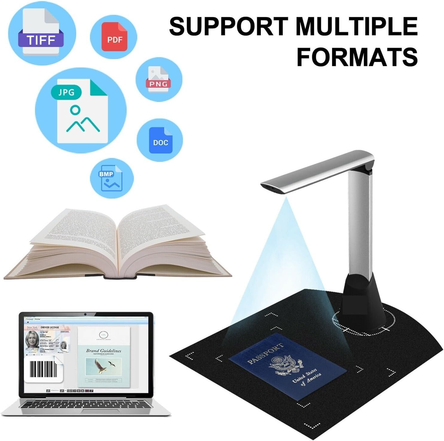 Design multifonction : notre scanner de documents dispose de lumières LED brillantes, ce qui rend la numérisation plus précise et précise. Le scanner prend en charge plusieurs fonctions, telles que la correction automatique, la segmentation d’image et la fusion des deux côtés des photos de documents numérisées.