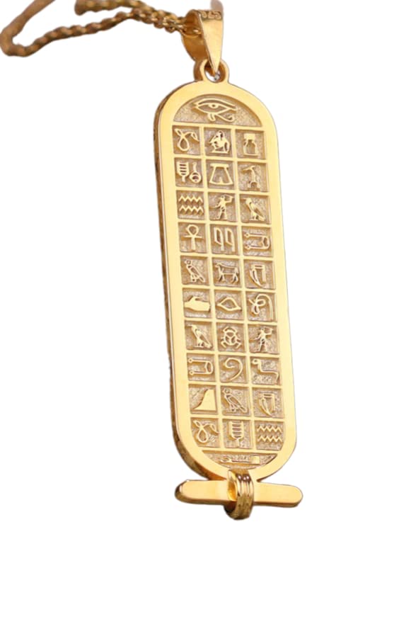 Votre collier avec une cartouche comportera des hiéroglyphes égyptiens. Veuillez nous faire savoir si vous préférez qu’il soit rédigé en anglais ou dans toute autre langue.