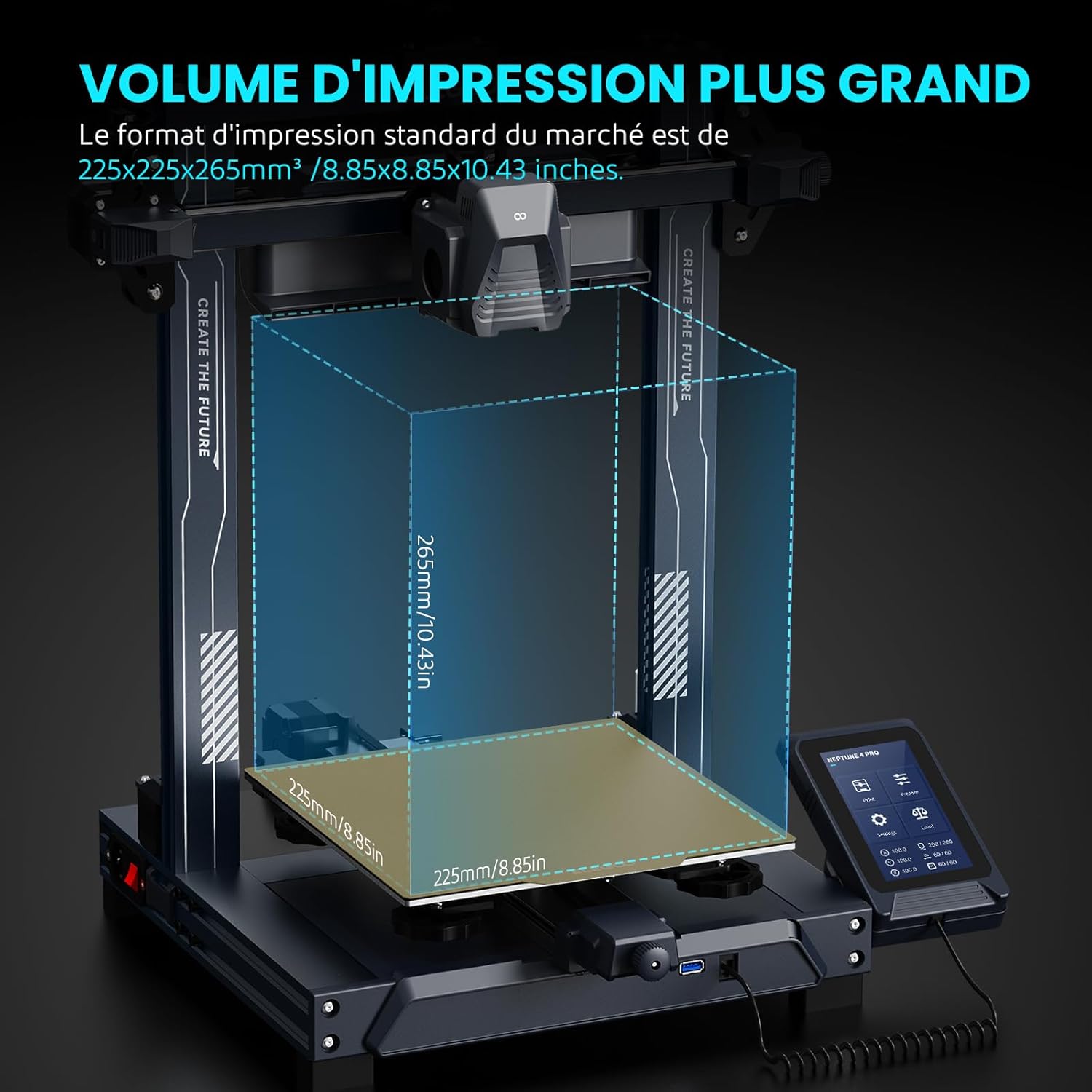 【Qualité d’impression fiable】La conception de la vis de guidage de l’axe Z double rend le fonctionnement de Neptune 4 plus stable et plus fluide, permettant d’imprimer à grande vitesse tout en garantissant une qualité d’impression fine. Volume de construction de 225x225x265mm