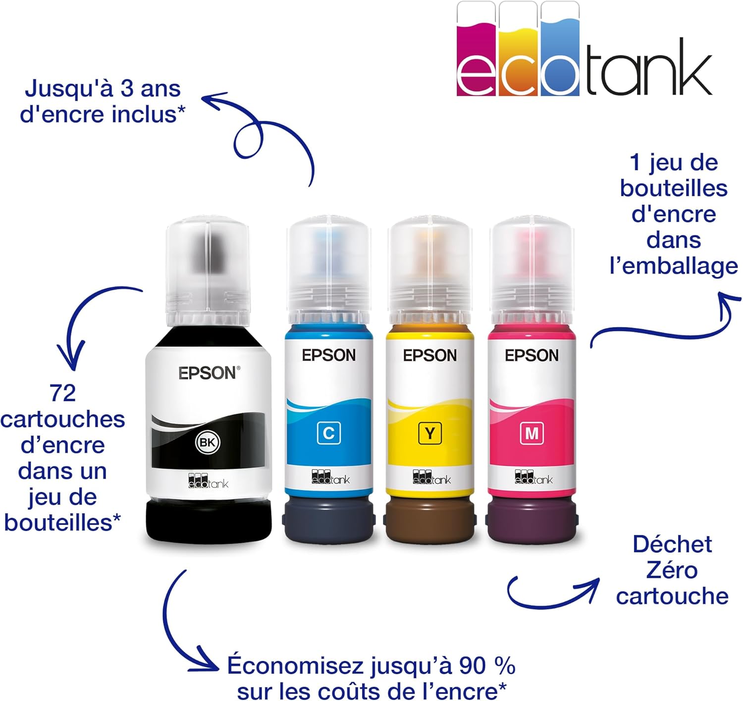 Impressions A3 à partir d’un modèle compact. L’imprimante compacte ET-15000 EcoTank prend en charge l’impression, la numérisation, la copie et le fax au format A4, tout en permettant d’imprimer au format A3+ à partir du bac d’alimentation arrière. Par ailleurs, son écran LCD permet d’imprimer sans connexion à un ordinateur. . . Ultra économique. Ce modèle EcoTank peut diminuer vos coûts d’impression de 90 % en moyenne1 grâce à son design innovant. Il est équipé de réservoirs d’encre grande capacité qui remplacent complètement les cartouches. . . Prise en charge d’un nombre accru de tâches. La fonction fax, un bac de 250 feuilles, des vitesses d’impression de 17 ppm2, la fonction d’impression Recto Verso et un chargeur automatique de documents (ADF) de 35 pages vous permettront d’accomplir tout un éventail de tâches facilement et rapidement. De plus, cette imprimante est équipée de la tête d’impression Zéro Chaleur PrecisionCore, réputée pour sa vitesse, sa fiabilité et son efficacité, et qui résistera jusqu’à la fin de vie de l’imprimante.. Impression possible de quasiment n’importe où. Avec EcoTank, imprimez directement depuis vos appareils mobiles, tablettes et ordinateurs portables. Grâce au Wi-Fi® et au Wi-Fi Direct™, vous pouvez envoyer vos documents à imprimer depuis des appareils mobiles via l’application Epson iPrint3. . . Conception spéciale pour une simplicité d’utilisation. Ce nouveau modèle EcoTank est plus compact et simple d’utilisation que jamais. Ses réservoirs en façade sont conçus pour des recharges faciles et les bouteilles ont été mises au point de façon à empêcher toute erreur de remplissage des couleurs. Grâce à l’affichage du niveau de l’encre en façade, il est facile de savoir quand une recharge est nécessaire.