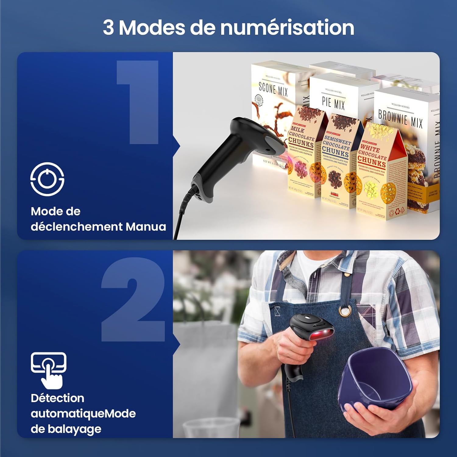 Permet de scanner rapidement et avec précision les codes-barres 1D et 2D à partir d’un écran ou d’un support papier.