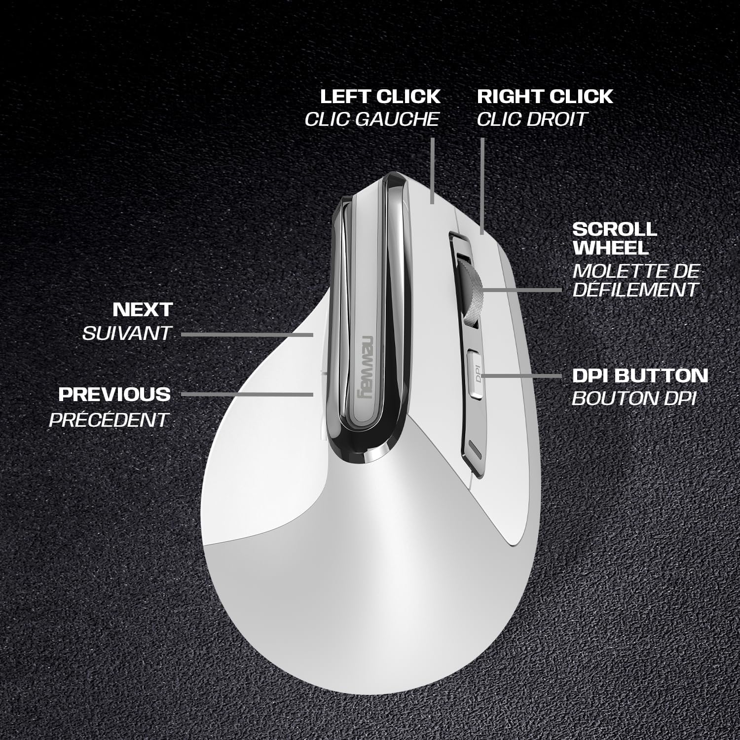 Fiche Technique NEWWAY – A9 Wireless Vertical Mouse – WiFi 2.4 GHz/Wireless/USB C – Rechargeable – RGB – 2400 DPI – Ergonomic – Quiet – Built-in Nano Receiver 10 M – White au Maroc