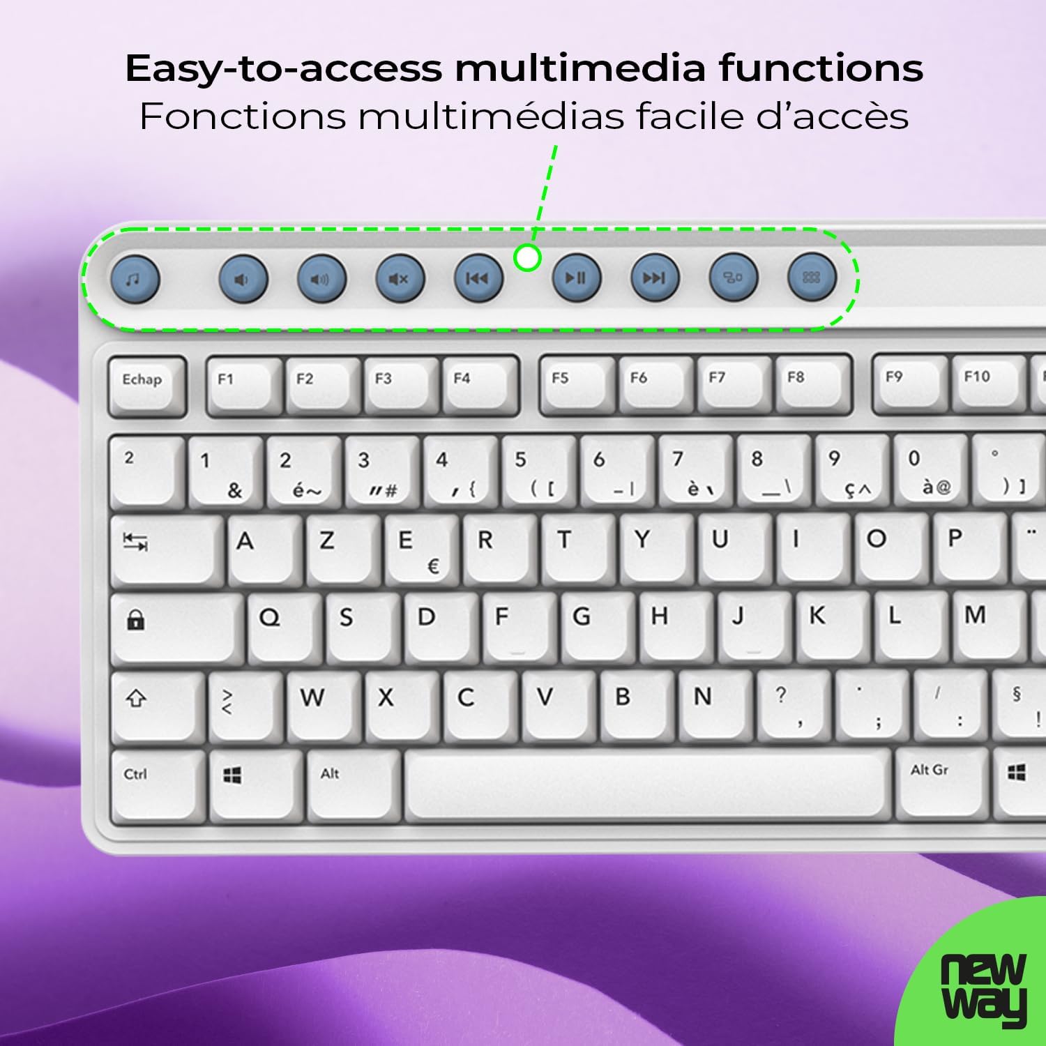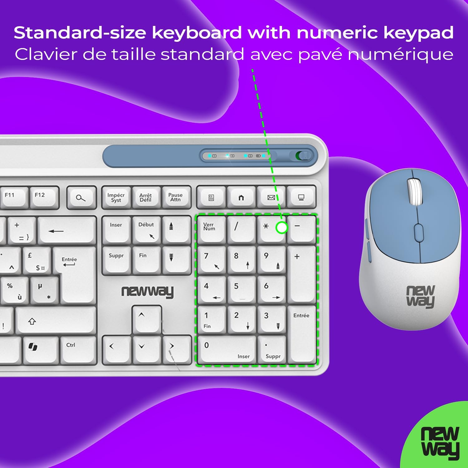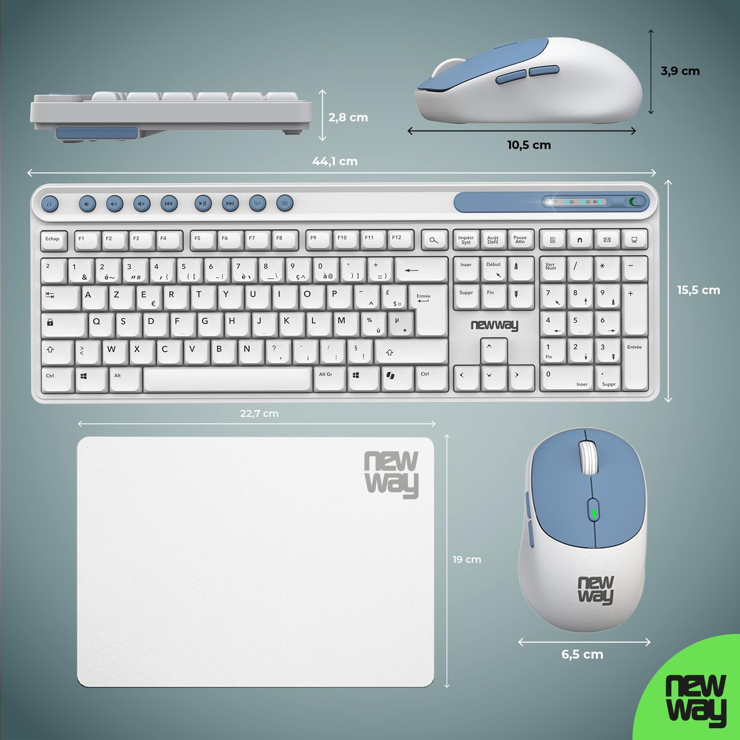 Fiche Technique NEWWAY NKMP252 Wireless Keyboard Mouse 2.4 GHz AI Copilot – French AZERTY – Silent Typing, 14 Multimedia Keys, Lightweight 6 Button Mouse, Mouse Pad Included, Long Battery Life (White) au Maroc