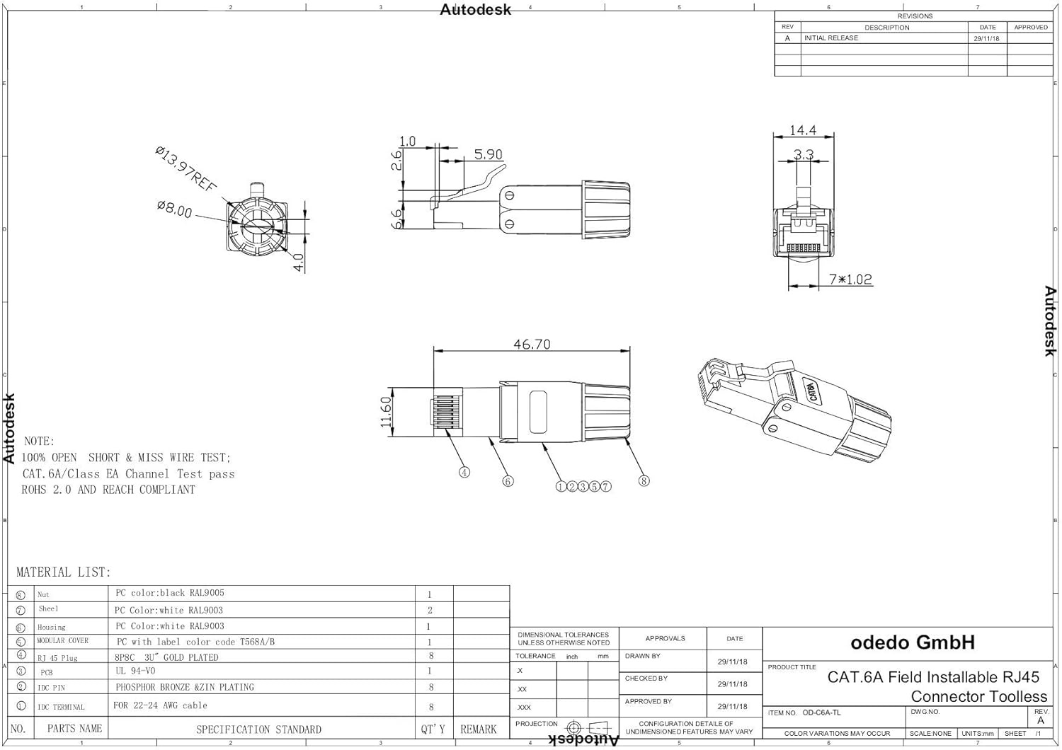 Fiche Technique odedo 10x CAT 6A RJ45 network connector tool-free AWG 22-24 crimp connector gold-plated contacts, cable up to 8 mm, patch cable, laying cable au Maroc