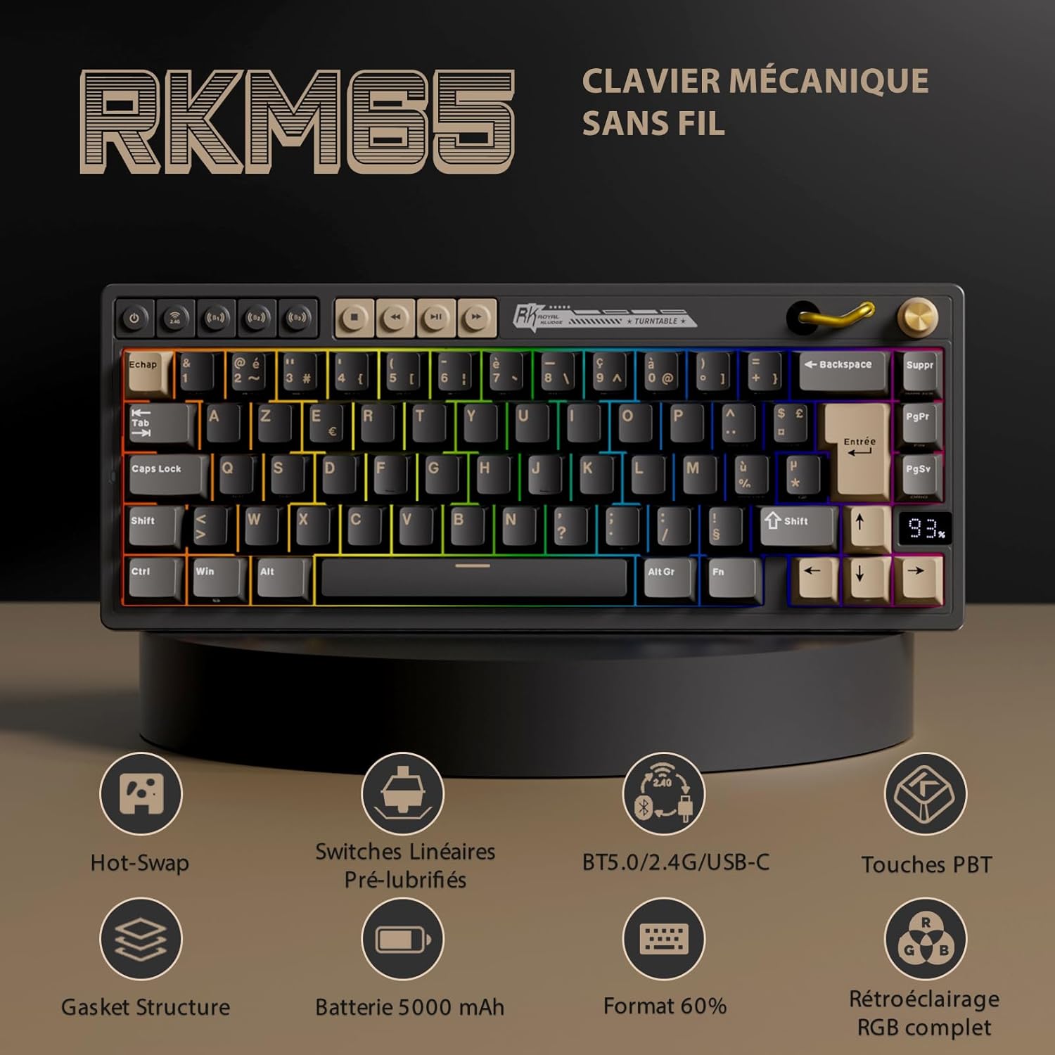 Avis sur RK ROYAL KLUDGE M65 60% Compact Mechanical Keyboard – Triple Connection (Bluetooth/2.4G/USB-C), Azerty Wireless RGB Keyboard, Hot-Swap, Button, 6000mAh Battery, PBT Keycaps, Creamy Switch
