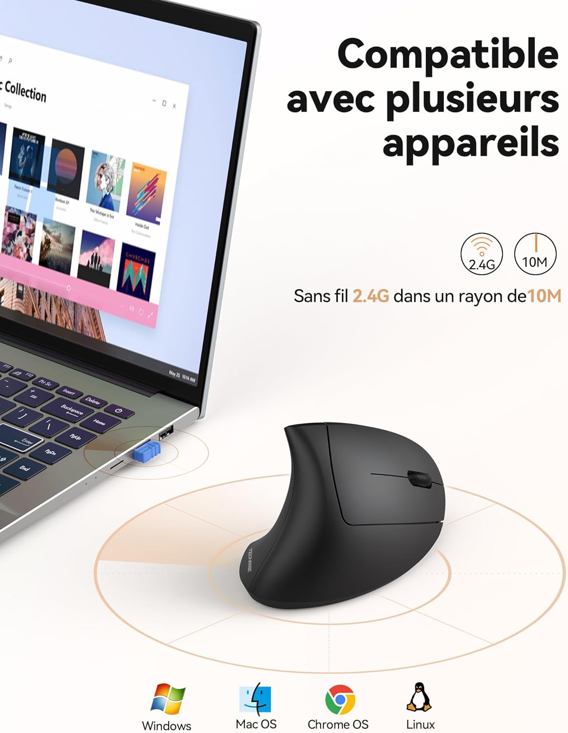 Compatibilité Étendue: Cette souris ergonomique polyvalente est compatible avec une variété de systèmes d’exploitation, y compris Windows, Mac OS, Chrome OS et Linux (les boutons latéraux peuvent ne pas fonctionner sur Mac OS). Elle est conçue pour la performance sur diverses surfaces, assurant une utilisation fiable quelle que soit la texture ou le matériau.