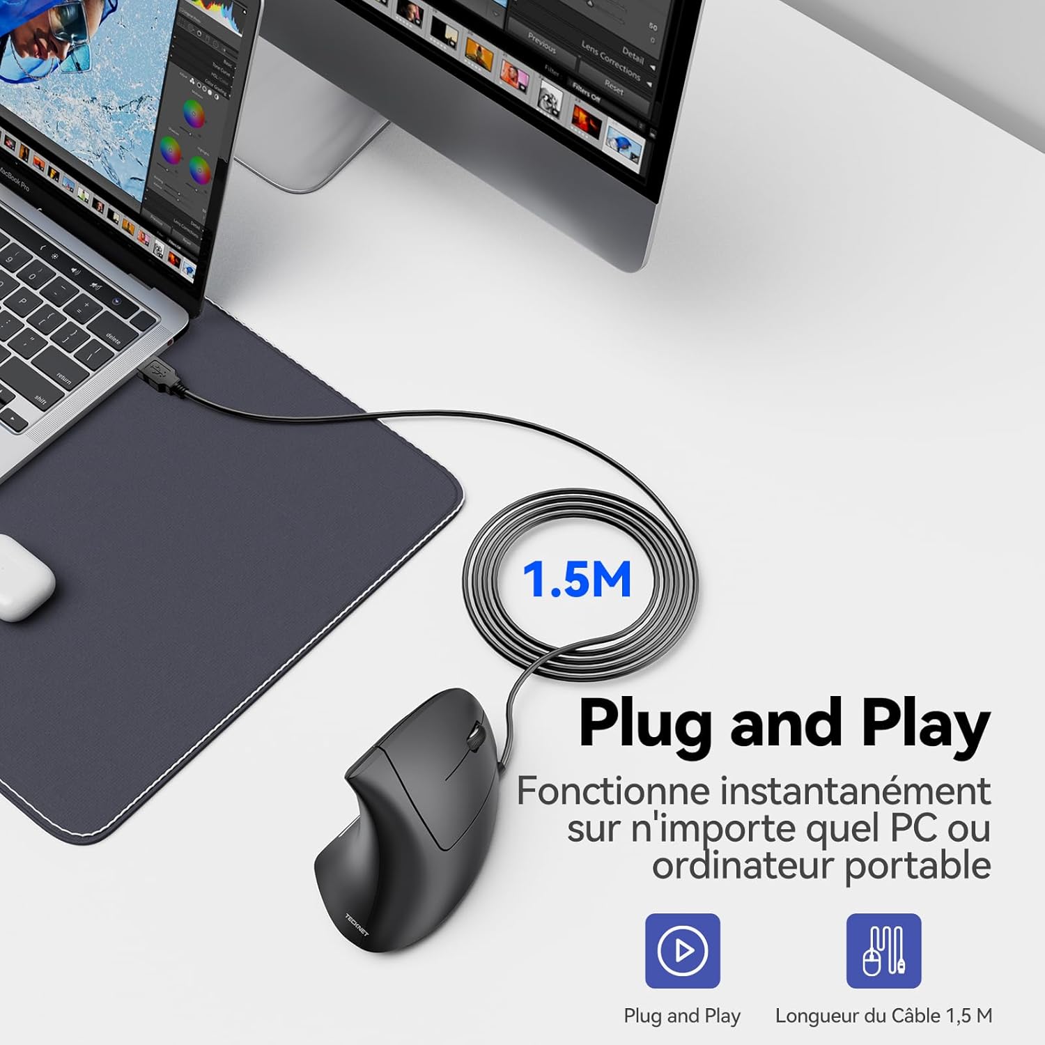 Fiche Technique TECKNET Souris Ergonomique Filaire, 6400 DPI Souris Verticale Filaire, Câble USB 1,5 m, 6 Boutons pour PC, Ordinateur, Portable, Mac – Noir au Maroc