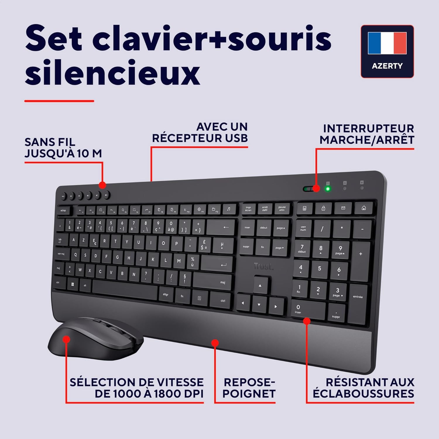 Fiche Technique Trust Trezo Wireless Keyboard and Mouse Set, French AZERTY Configuration, Durable Design, Quiet and Ergonomic Keyboard, Long Life Battery 48 Months, 2.4 GHz, PC, Laptop, Computer au Maroc