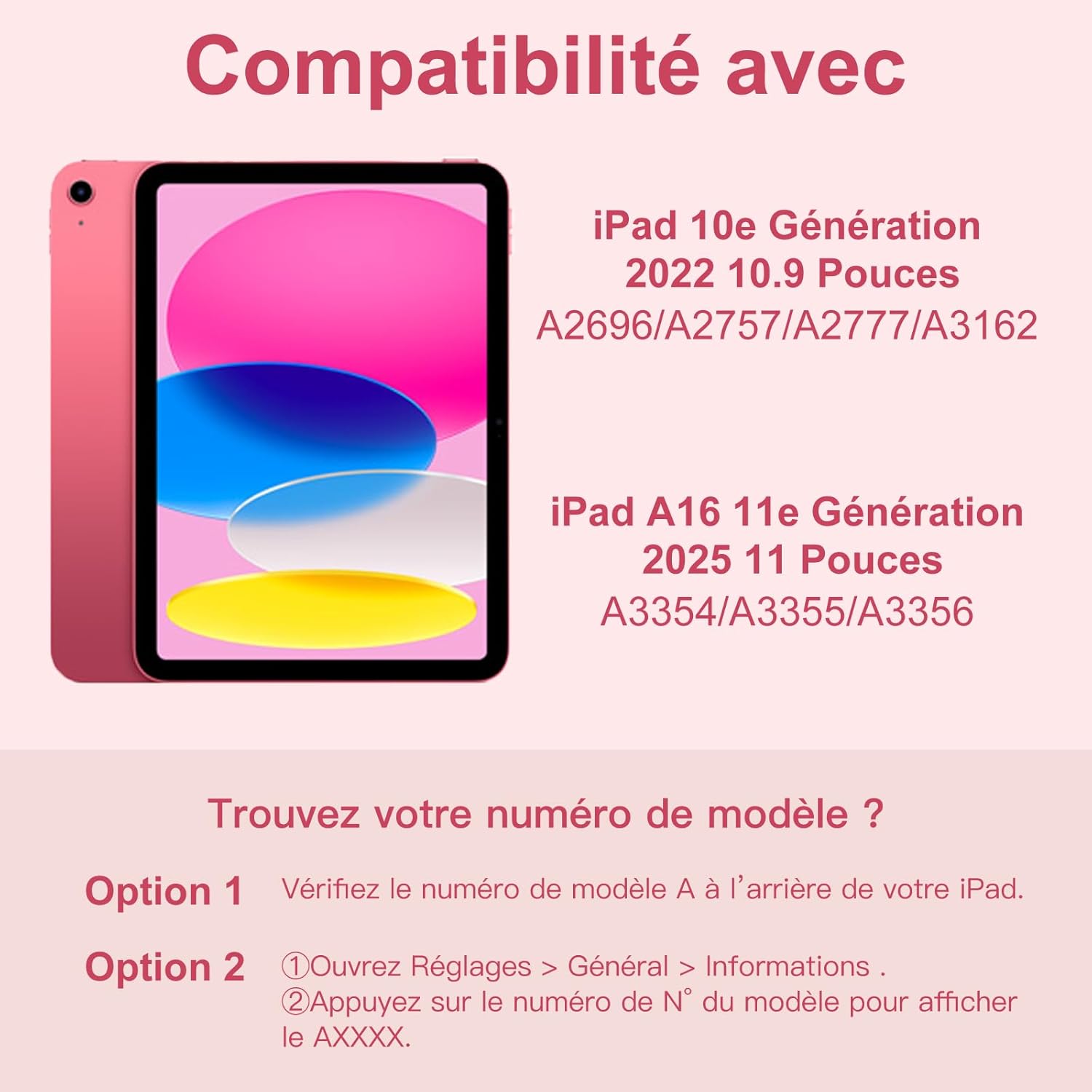 Cet Coque iPad est uniquement compatible avec iPad A16 11ème génération 2025 11 pouces (numéro de modèle: A3354/ A3355/ A3356), iPad 10ème génération 2022 (Modèle : A2696/A2757/A2777). Il n’est pas compatible avec d’autres modèles.