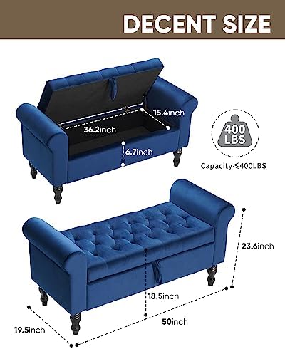 Fiche Technique XSPRACER Banc de rangement pour chambre à coucher, banc ottoman de rangement à bras roulés, bout de lit, ottoman rectangulaire pliable, pour chambre à coucher, bleu