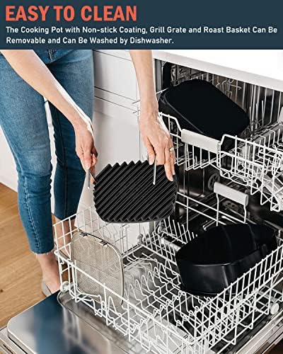 【Facile à nettoyer】 Le couvercle intérieur et le couvercle de protection de notre gril de comptoir électrique d’intérieur sont constitués d’un revêtement antiadhésif résistant aux hautes températures, il suffit de prendre un torchon pour l’essuyer après utilisation. De plus, le panier à rôti, la lèchefrite et la marmite peuvent être lavés au lave-vaisselle. Nettoyer l’intérieur de la friteuse à air chaque fois qu’elle refroidit contribuera à prolonger sa durée de vie.