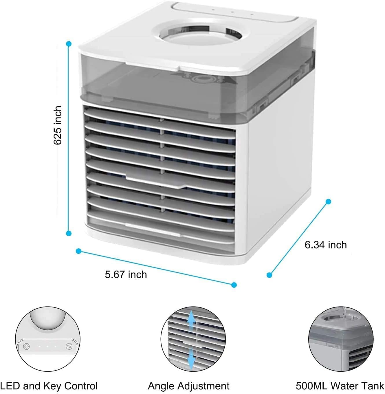 Taille: 5,67 * 6,34 * 6,25 poucesPoids net: 1,76 lbPuissance: 10WDistance du vent: 5 piedsAngle de soufflage: 90 ° perpendiculaireVitesse du ventilateur: forte / moyenne / petiteNiveau sonore (dB): moins de 68Capacité du réservoir d’eau: 500 mlÉclairage: LED 7 couleurs