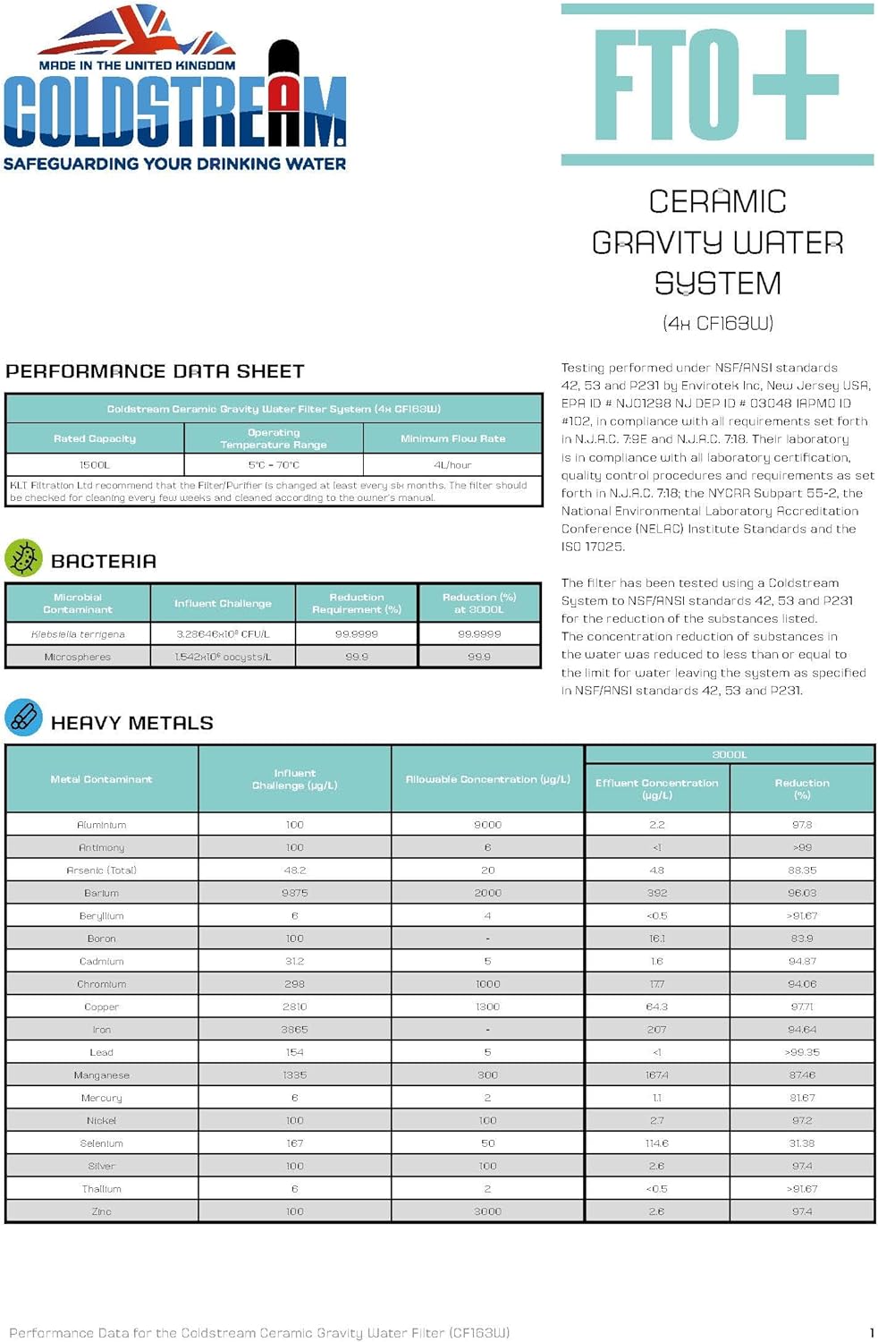Coldstream Sentry FTO+ 2.9 x 8 Inch Ceramic Gravity Water Filter (Pack of 4) The powerful ceramic gravity filter is compatible with all Doulton (British Berkefeld) and Big Berkey (and larger) filter housings and is a great upgrade choice as the filters have fantastic performance, especially when it comes to reducing fluoride, hormones and pharmaceuticals in the water. In other systems, such as the Doulton Super Sterasyl and Doulton ATC Super Sterasyl or the Berkey Black Elements, both require the PF-4 and PF-2 filters for fluoride and arsenic (respectively) that occupy space in the lower chamber, minimizing the space available for storage of filtered water and adding cost to the process. Removal of contaminants, elimination of bacteria (E.coli, cholera, shigella, typhoid, Klebsiella terrigena) – 99.999% cyst suppression (Cryptosporidium/Giardia) – 99.999% volatile organic contaminants – 94% – 99% lead, cadmium, selenium. um, zinc removal: 100% of heavy metal contaminants (up to NSF 53c) – 97% of pesticide contaminants – 99.9% of herbicide contaminants – 99.9% free chlorine removal (chlorine taste and odor) – 99.9% chloromine removal – 99.9 cm % Flu Elimination – Oruro Elimination – Performance Flow Rate 97.0% – 1.0 L/h Operating Temperature – min 5°C / Max 30°C Lifespan – 6 months (recommended) Critical dimensions per filter Diameter – 2.9 inches Length – 8 inches Fitting Type – ¼ Inch BSP Length – LM (26mm) This excellent gravity filter is compatible with the Doulton (British Berkefeld) Filter Cartridge, Propur Big and King and the Big Berkey Housing