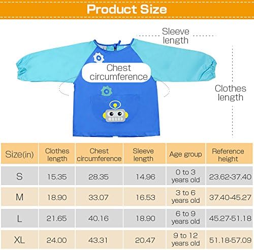 Devant le tablier se trouve une grande poche avec une image de dessin animé de robot, les enfants peuvent contenir des peintures, des pinceaux, des stylos à eau et d’autres outils.