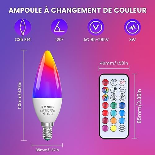 Fiche Technique DoRight 3W E14 Ampoule bougie, C35 LED à changement de couleur avec télécommande, fonction mémoire, équivalent 40W, RVB + blanc chaud 3000K à intensité variable (2 pièces) au Maroc