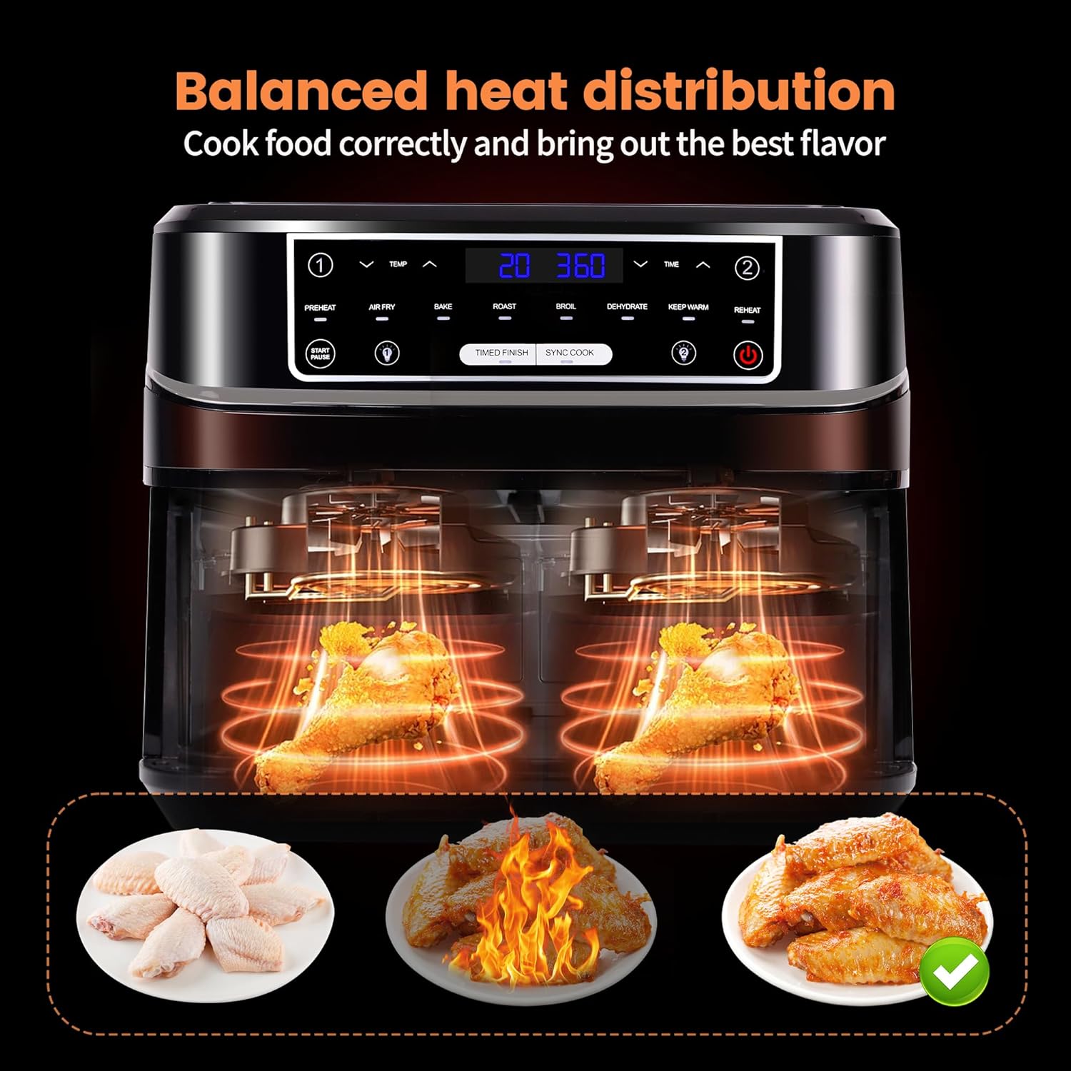 【Smart Touch Control, Large Viewing Window】The dual air fryer is equipped with a user-friendly and accurate touch LED screen, allowing easy operation and adjustments. The large illuminated viewing window provides a clear view of the cooking process, allowing you to monitor the condition of the food inside at all times and avoid sub-c cooking or overcooking.