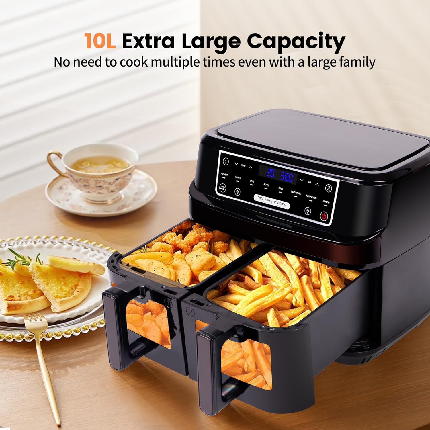 Voici le prix pour acheter Emphsism 10L Double Oil Free Air Fryer with 2 Compartments with Window, XXL Air Fryer with 2 x 5 L Drawers, Airfryer with Touch Screen and 8 Automatic Programs au Maroc
