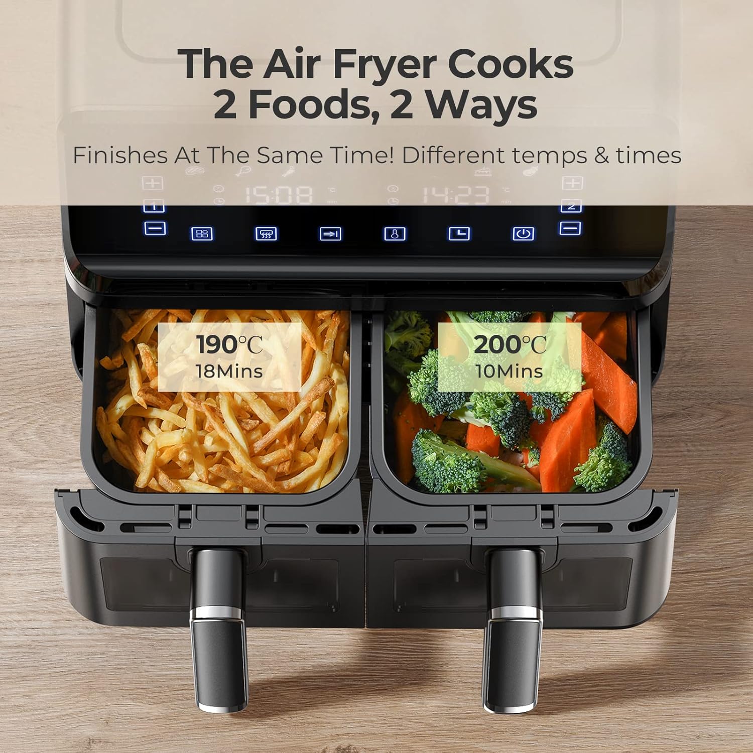 2 Zones de Cuisson Indépendantes: Complète avec deux grands paniers de 4L chacun (8L de capacité totale), vous pouvez utiliser un panier pour la cuisson de portions plus petites ou les deux paniers en même temps pour vous aider à servir rapidement et obtenir deux fois le résultat avec la moitié de l’effort. Elle garantit que les deux types d’aliments conservent leur goût original, réalisant ainsi l’effet d’aucune saveur croisée.