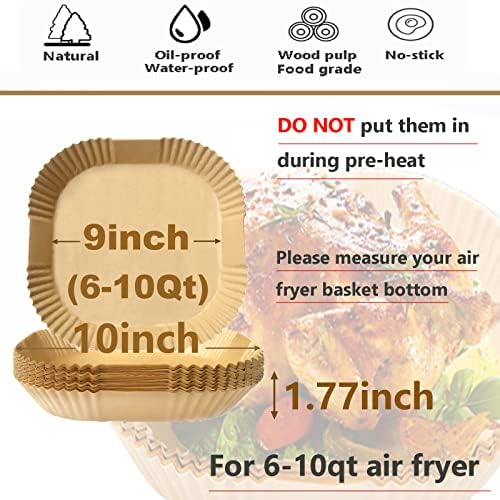 Taille des doublures pour friteuse à air : 22,9 x 22,9 x 4,5 cm, la plus grande taille de doublures pour friteuse à air : 100 doublures carrées jetables en papier pour friteuse à air. Nos doublures pour friteuse à air sont de 25,4 cm, la taille inférieure est de 22,9 cm, papier pour friteuse à air, parfaites. Pour friteuse à air de 6 à 10 litres. Veuillez mesurer la taille inférieure du panier de votre friteuse à air avant l’achat.