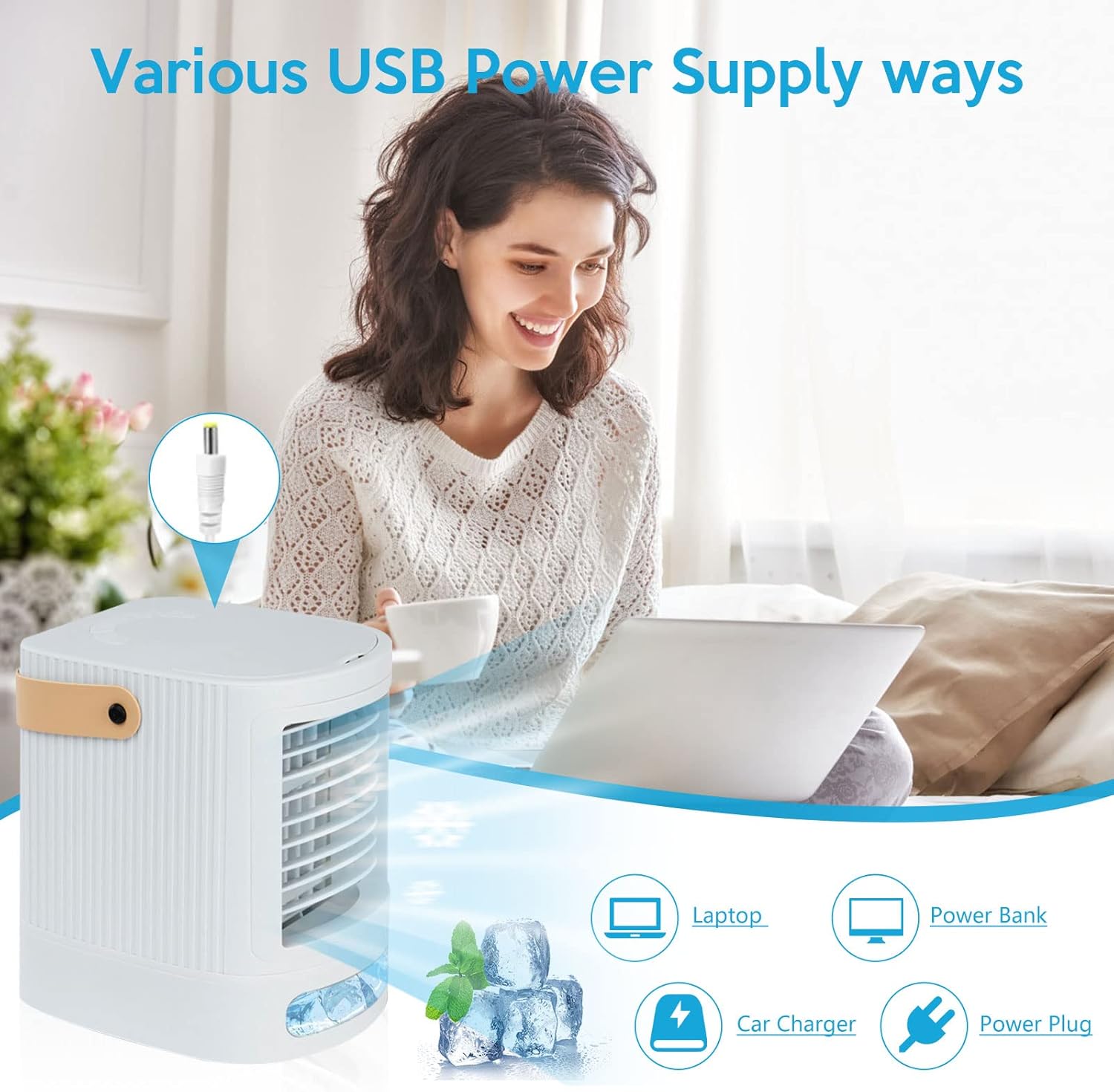 【USB Alimenté et Facile à Connecter】Ce refroidisseur d’air personnel fonctionne via une alimentation USB, qui prend en charge une variété de moyens d’alimentation pour s’allumer, tels que les banques d’alimentation, les ordinateurs, les chargeurs de voiture, les prises de courant, etc. Que vous soyez à la maison, au bureau, au patio ou au café, il est facile de se brancher partout. Remarque : un câble USB est inclus dans l’emballage.