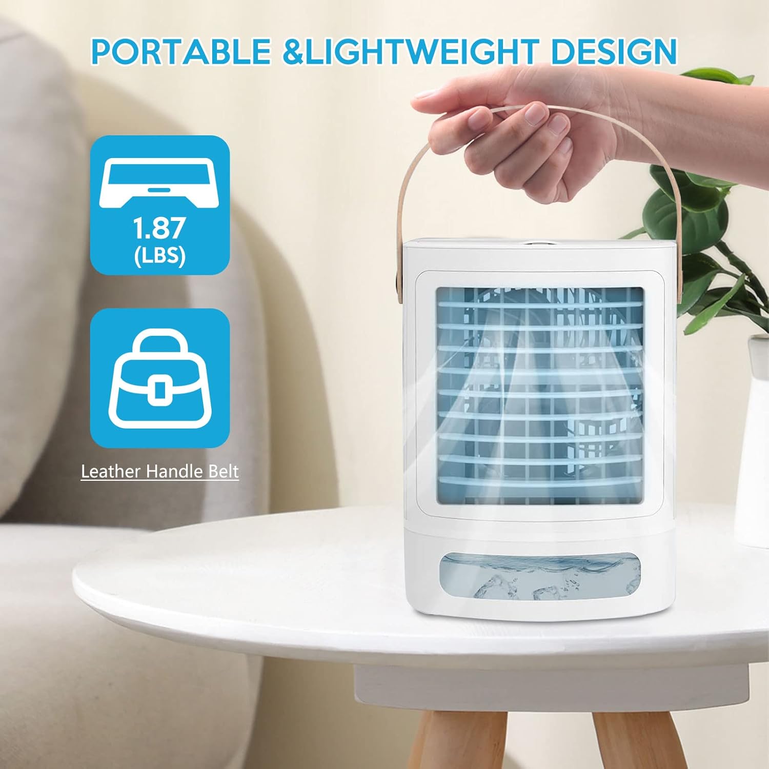 【Déplacement Facile】Ce mini climatiseur est livré avec une ceinture de poignée en cuir, taille compacte 6 x 7 x 7,4 pouces, plus le poids léger de seulement 1,87LBS. Climatiseur Mobile peut non seulement être utilisé dans votre maison, mais aussi très approprié pour transporter, camping, etc, profitez de la fraîcheur à tout moment, n’importe où! C’est un excellent complément au ventilateur de bureau!