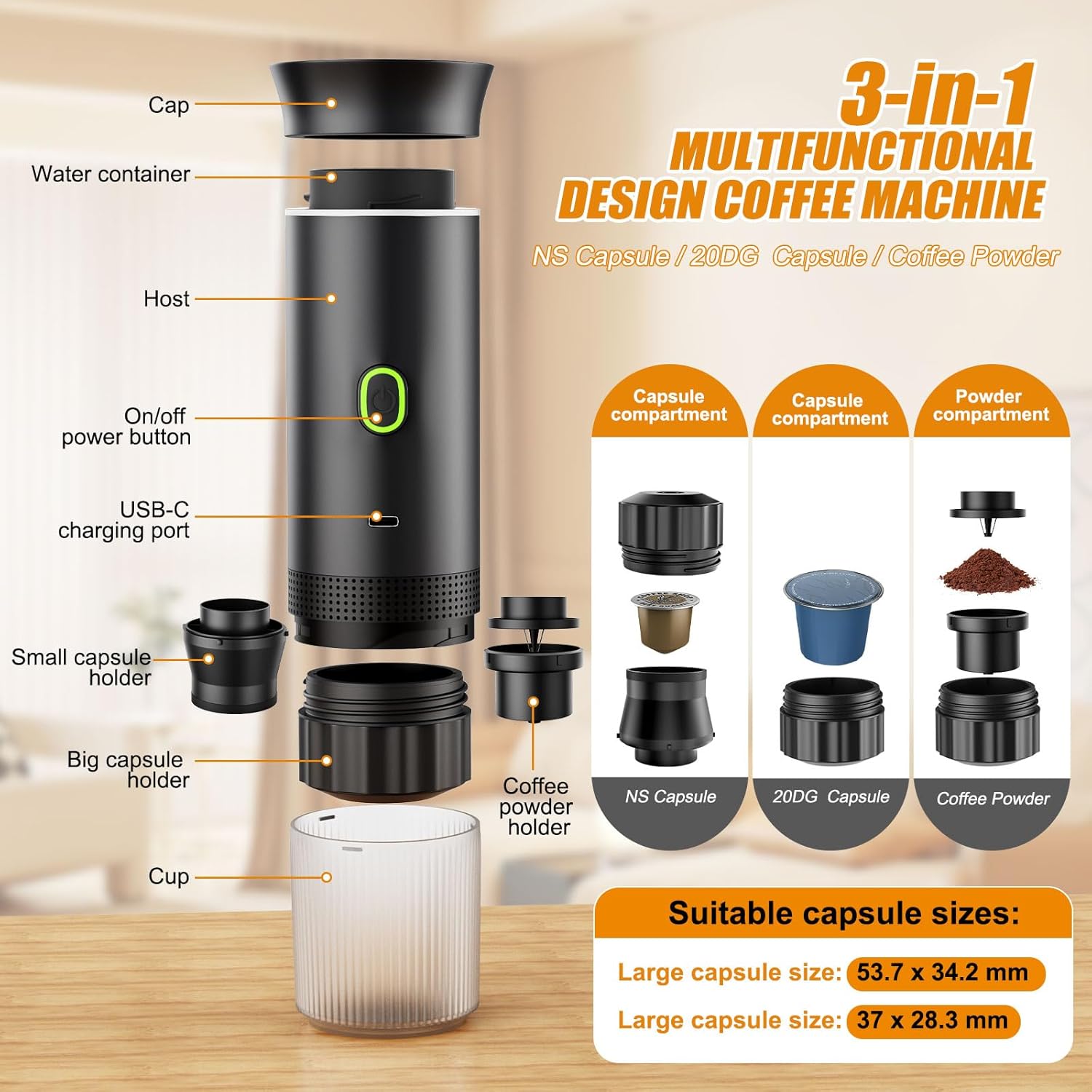 【Compact and Portable】The automatic espresso machine weighs only 700g. The size of a water bottle, it is super easy to pack and carry. Its compatibility with a USB-C car charger makes it ideal for all travel scenarios