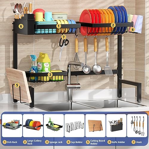 Les acheteurs qui ont testé SNSLXH 2-Tier Over The Sink Dish Drying Rack, Kitchen Large Sink Rack, Suitable for Most Sinks, Effective Drainage Drying, Kitchen Drying Rack, 24.8″-35.4″ ont donné la note 4.5/5