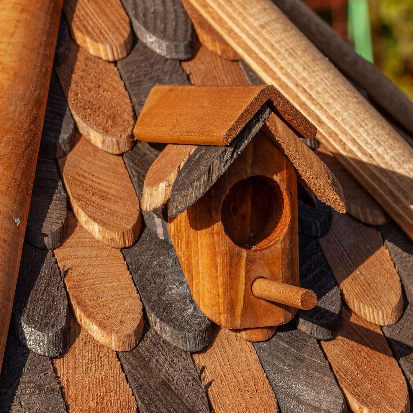 Two-tone shingles – With its two colourful autumnal style shingles, the bird house is an eye-catcher in any garden, terrace or balcony