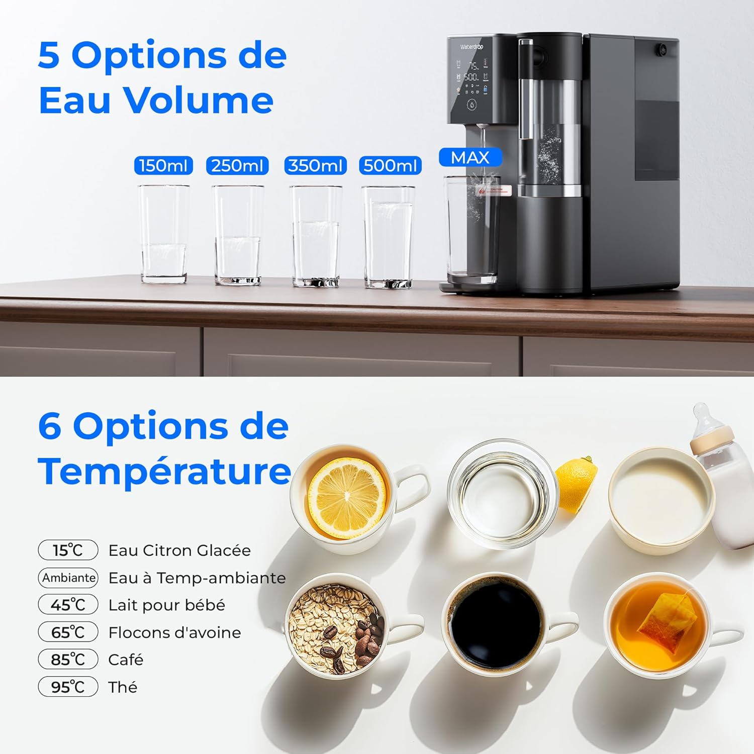 Fiche Technique Waterdrop WD-A2 Reverse Osmosis System, Hot and Cold System, Portable Pure Water Tank, Bottle-Free Water Cooler, 6 Temperature Settings, Hot and Cold Water, 3:1 Pure Draining au Maroc