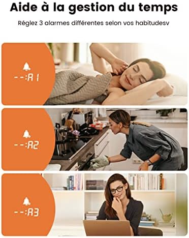 【3 réglages d’alarme】3 groupes d’alarme vous permettent de définir différentes heures de réveil. Bouton multifonctionnel, les étapes de fonctionnement peuvent être un peu compliquées. Lorsque l’alarme est activée, elle peut facilement vous réveiller par un simple bip sonore. Appuyez sur l’un des boutons situés à l’arrière du réveil pour l’arrêter. Dites non aux retards, ne manquez jamais un moment important ou une réunion.