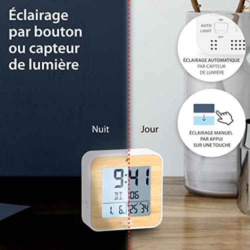 Fiche Technique ADE Réveil numérique avec Signal horaire DCF | 2 Heures de réveil | Affichage de la température e humidité | boîtier en Bambou véritable | réveil de Voyage | Fonction Snooze