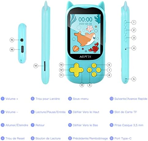 Fiche Technique AGPTEK MP3 Enfant Bluetooth 5.3 avec Haut-Parleur, Mignon Chat Design Enfant Lecteur 8Go Écran TFT 2,4 Pouces, Baladeur MP3 Garçon avec Bouton de Jeu/Volume, Radio FM,Réveil,Carte TF Jusqu’à 128G-Bleu