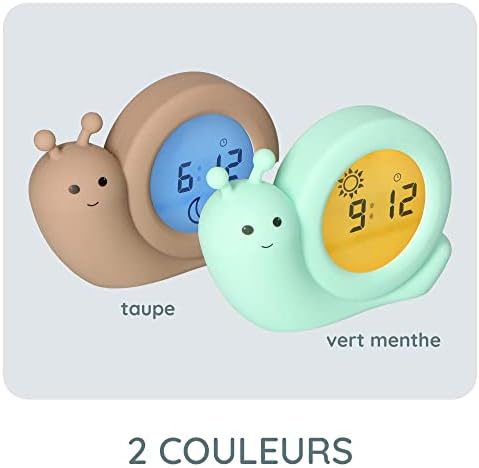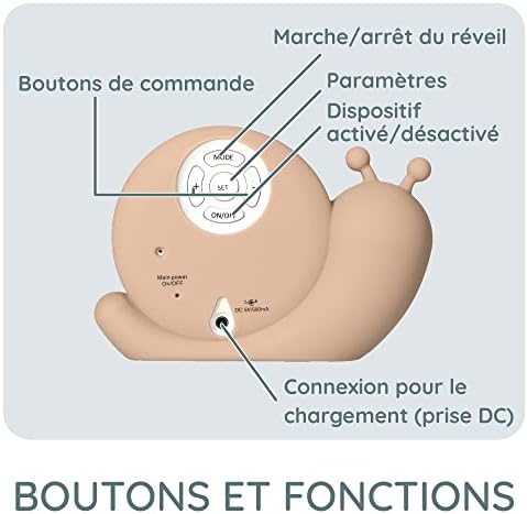 Le modèle BC110BE SIMON de la marque Alecto Baby est un produit deux-en-un : il s’agit à la fois d’un réveil pédagogique et d’une veilleuse. Ce, sous la forme d’un gentil escargot, du nom de Simon. Ce réveil pédagogique permet aux jeunes enfants d’acquérir la notion du temps. En tant que parent, vous définissez l’heure à laquelle votre enfant peut se lever. L’écran est de couleur bleue et affiche une lune ? C’est le signe qu’il est l’heure d’aller se coucher. Il est l’heure de se lever. L’écran du réveil BC110BE SIMON est de couleur orange et affiche un soleil. Le réveil BC110BE SIMON est livré avec un câble de chargement de très grande longueur (200 cm), il est également rechargeable, il est donc mobile et peut être utilisé sans fil. Principales caractéristiques- Horloge/réveil avec alarme et affichage numérique de l’heure Aide les enfants à acquérir la notion du temps. Incite les enfants à rester au lit, les parents peuvent ainsi davantage se reposer. Soleil et écran de couleur orange : il est l’heure de se lever Lune et écran de couleur bleue : il est l’heure de se coucher Déterminez la couleur de la veilleuse, l’intensité est réglable (sept positions et désactivation). Sans fil et rechargeable, le réveil est parfait pour les nuits passées à l’extérieur de la maison. Il peut facilement être installé partout grâce au câble de chargement de 200 cm. Réveil pédagogique. Le réveil pédagogique BC110 aide les enfants à acquérir la notion du temps. Il est parfait pour les enfants qui ne savent pas encore (bien) lire l’heure. Les enfants ont parfois du mal à savoir s’il fait jour ou s’il fait nuit. Ils se réveillent et pensent qu’il est l’heure de se lever alors qu’ils peuvent encore rester plusieurs heures au lit. C’est souvent le problème lorsque les jours rallongent ou raccourcissent et lors des changements d’heure. Comment fonctionne ce réveil pédagogique- Vous définissez l’heure à laquelle vous souhaitez que votre enfant se lève sur le réveil pédagogique BC110. Vous installez le réveil pédagogique à un emplacement bien visible dans la chambre de votre enfant. La nuit, l’écran est de couleur bleue et affiche une lune. Cela indique à votre enfant qu’il n’est pas encore l’heure de se lever. L’heure que vous avez définie est atteinte. L’écran passe alors du bleu à l’orange et affiche un soleil. Il est l’heure de se lever ! Vous pouvez ainsi apprendre à n’importe quel enfant, même s’il ne sait pas encore lire l’heure, à rester plus longtemps au lit et accorder davantage de repos aux parents. Réveil avec alarme Le réveil Alecto Baby BC110BE SIMON dispose également d’une alarme. Il vous suffit de régler l’heure de réveil et l’alarme. L’écran passe alors du bleu à l’orange et l’alarme se déclenche. Veilleuse Le réveil BC110 peut également être utilisé en tant que veilleuse. L’écran éclairé diffuse une lumière agréable dans la chambre et procure un sentiment de sécurité et de protection à votre enfant. L’intensité de l’éclairage de l’écran est réglable. D’un bleu vif et lumineux à une douce lueur bleue. Il en va de même pour l’éclairage orange. La luminosité de l’écran peut être réglée sur sept positions. L’éclairage peut également être éteint. Sans fil et rechargeable Le réveil pédagogique est rechargeable et peut donc être utilisé sans fil. Le chargement s’effectue à l’aide du câble USB de 200 cm fourni. Le réveil BC110 peut ainsi être facilement utilisé partout, avec ou sans câble. Le réveil BC110 est compact et peut facilement être emporté partout. Il est donc parfait pour les nuits passées à l’extérieur de la maison, votre enfant a en effet toujours un objet familier avec lui. Alecto Baby Il s’agit d’un produit de qualité de la marque Alecto Baby. De nombreux parents et grands-parents font confiance à nos produits pour améliorer et faciliter leur quotidien et les soins apportés à leurs enfants et petits-enfants. Avec Alecto Baby, vous optez pour un produit de qualité optimale, sûr, bien étudié et facile à utiliser. Alecto Baby : un choix en toute confiance. Contenu de l’emballage Réveil pédagogique BC110 Câble de chargement USB de 200 cm Manuel en néerlandais, anglais, allemand et français Informations de sécurité.