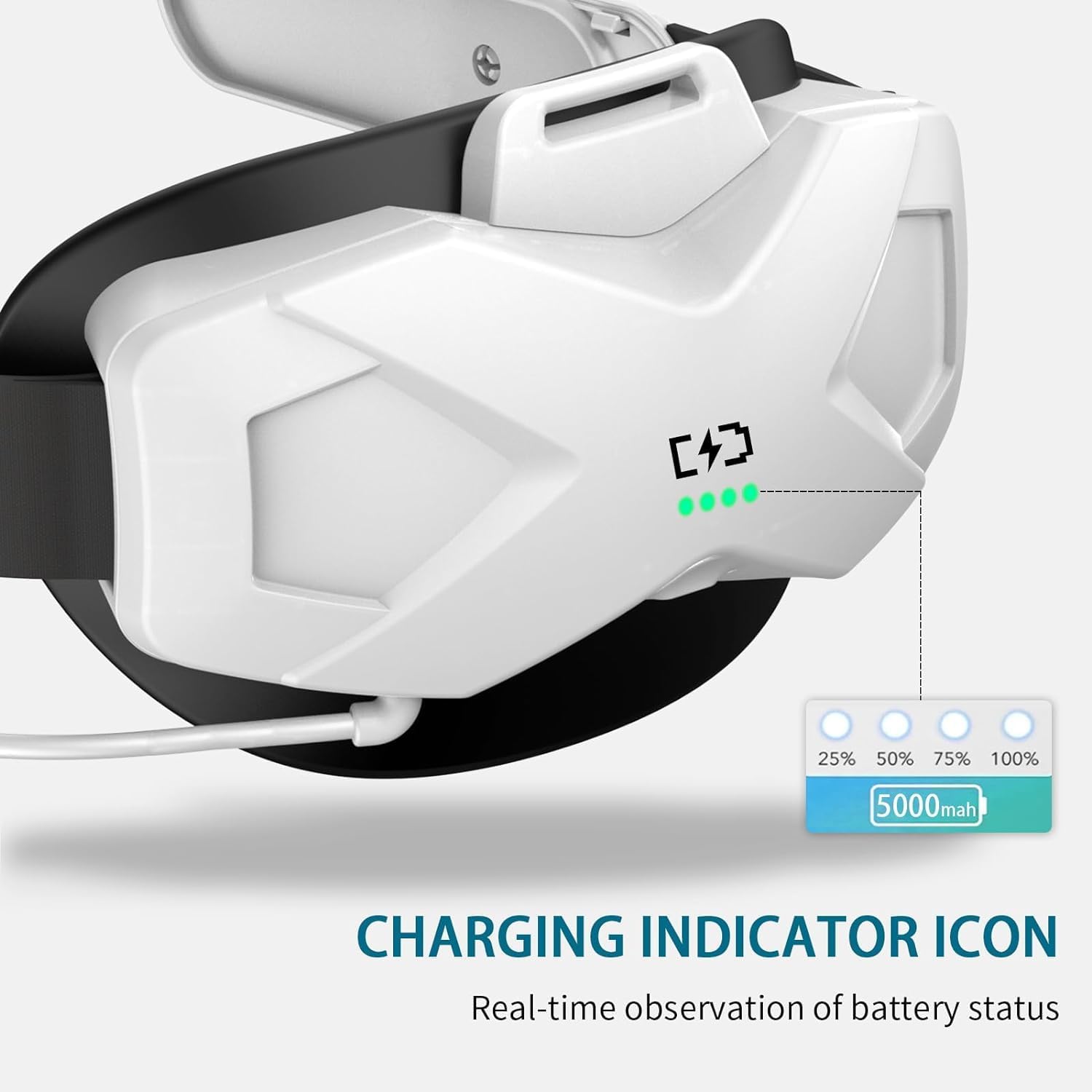 La sangle de remplacement est équipée d’une batterie intégrée de 5000mAh. Une charge complète permet de bénéficier de 3 à 4 heures supplémentaires de temps de RV, ce qui double le temps de jeu!