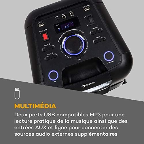 Fiche Technique auna Bazzter Système Audio de soirée – 2 subwoofer de 20,3 cm (2 x 8), Enceinte Bluetooth, 100W RMS, Batterie, USB, MP3, AUX, FM, Micro, Noir