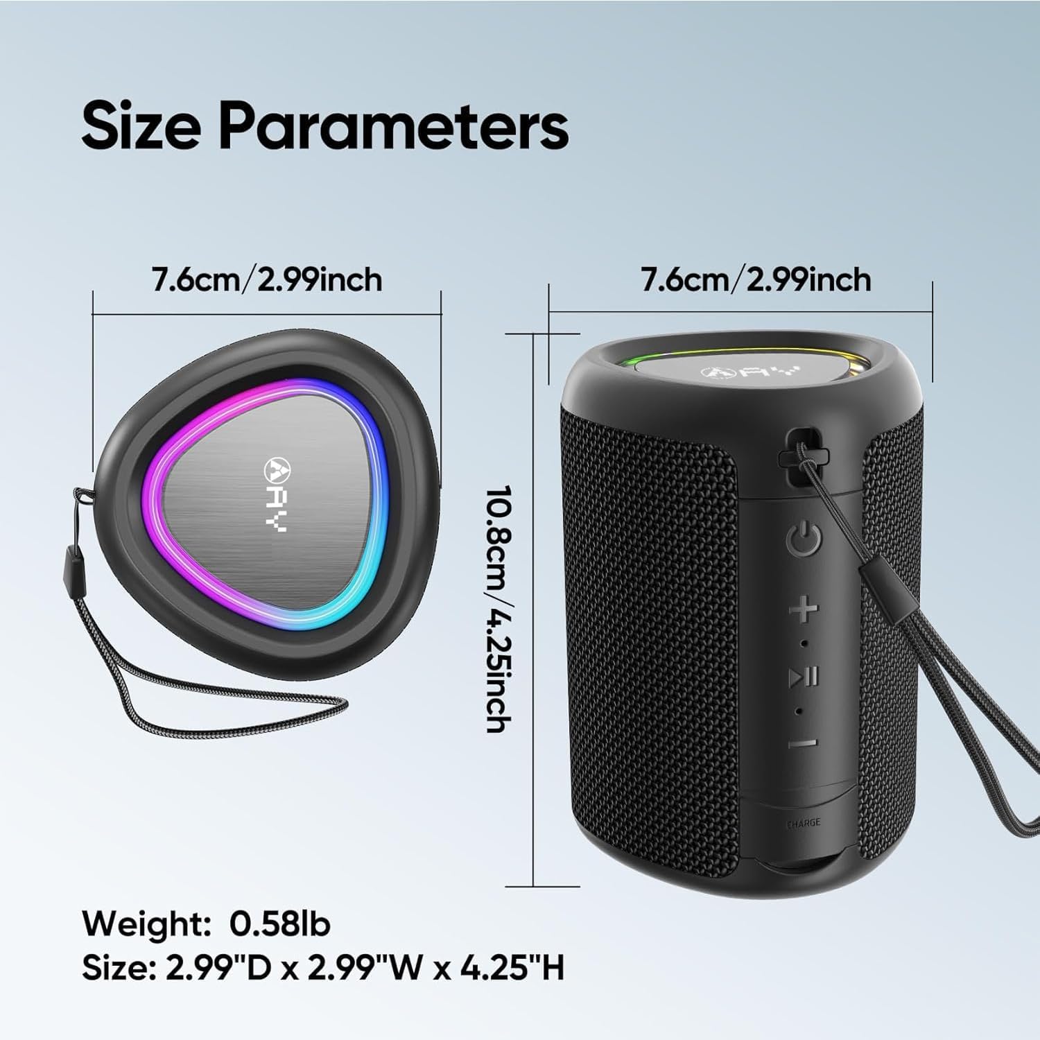 【Portable Design】: Compact and lightweight with a height of 4.5 inches and a diameter of 3.07 inches, this speaker is perfect for use on the go. It has a TF card slot (supports WAV / FLAC / APE / MP3 formats), 3.5mm AUX input port, Type-C fast charging and a lanyard for convenient carrying