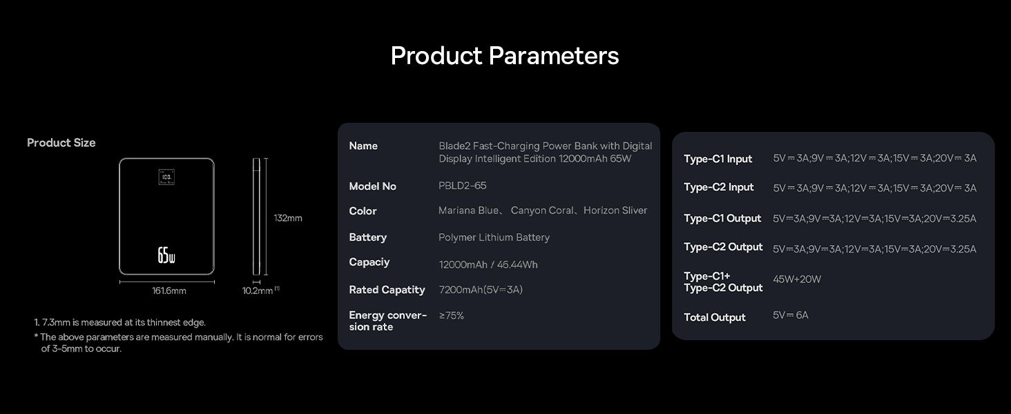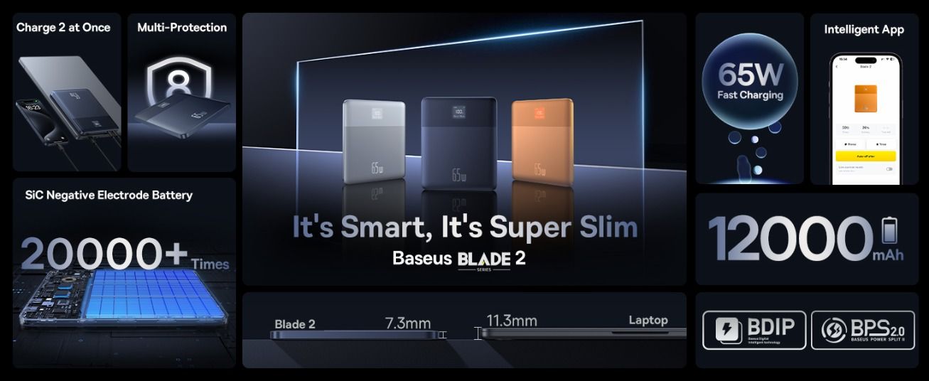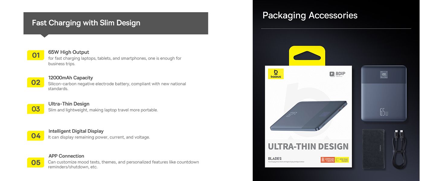 Fiche Technique Baseus Blade 2 batterie externe 65W 12000mAh PD Ultra Slim restante numérique pour Tél, Tablette, Macbook