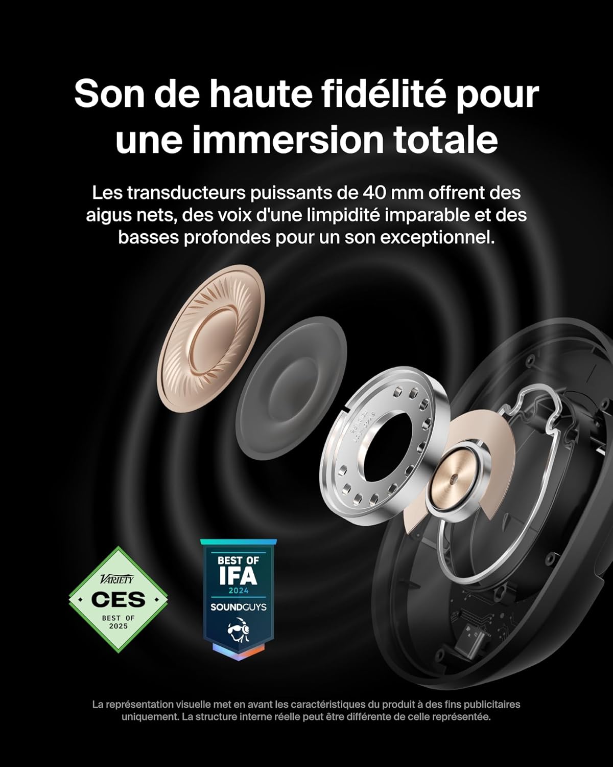 Fiche Technique Belkin SoundForm Isolate Wireless Bluetooth Headphones with Hybrid ANC (Noise Cancelling Headphones, 60 Hour Playtime, Deep Bass, CloudCushion Earbuds, On the Go Use) – Black au Maroc