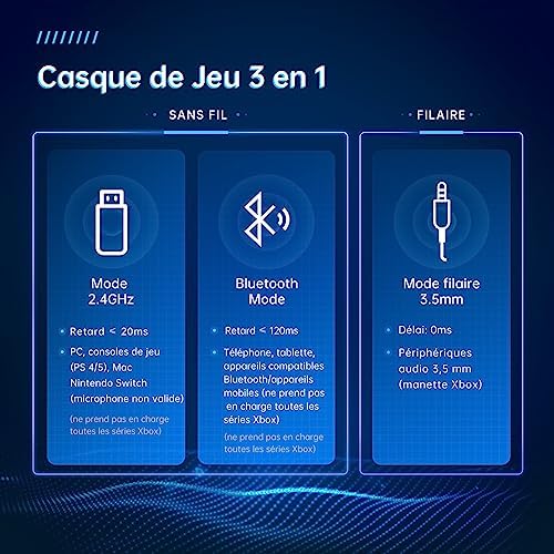 Fiche Technique Casque Gaming sans Fil, Casque Gamer 2,4 GHz pour PC/PS4/PS5/Nintendo Switch, Casque Gaming PS5 avec Transducteurs 50mm, Microphone Anti-Bruit, Casque PS4 avec Son Surround au Maroc