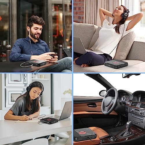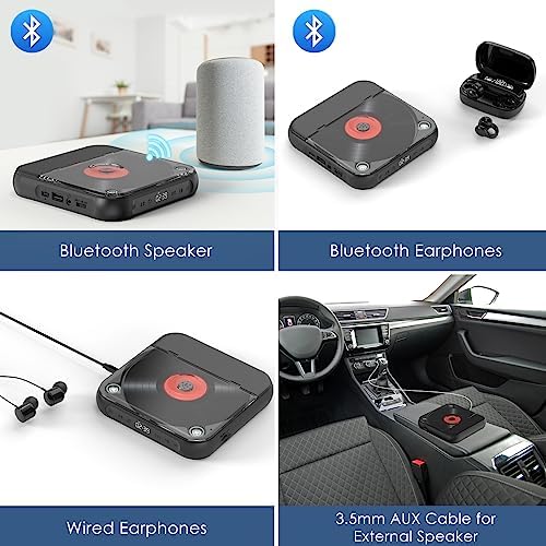 Lecteur CD Bluetooth : Puce Bluetooth haute performance intégrée, vitesse de transmission plus rapide, performances stables et capacité anti-brouillage élevée, compatible avec un casque ou un haut-parleur Bluetooth. Profitez de la musique sans fil sans délai. Remarque : si vous souhaitez connecter votre système audio de voiture, assurez-vous que votre voiture dispose d’une entrée/sortie AUX, elle ne peut être connectée qu’à l’aide d’un câble AUX.