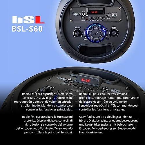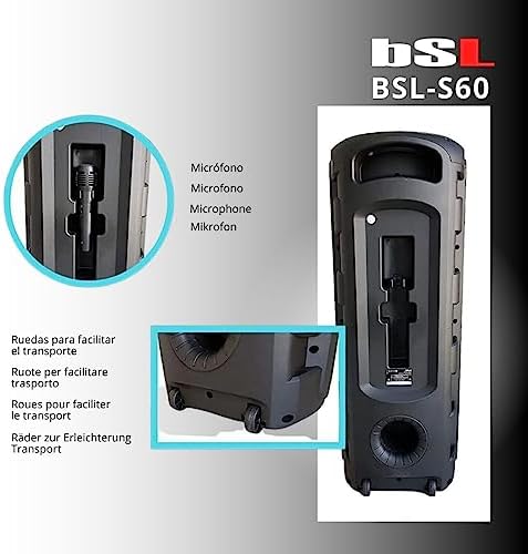 Avis sur Haut-parleur Bluetooth BSL-S60 avec éclairage RVB | 2 haut-parleurs de 8 pouces | 2 x 15 W RMS | Batterie de 4 heures | Fonction karaoké | Radio FM | USB | TF