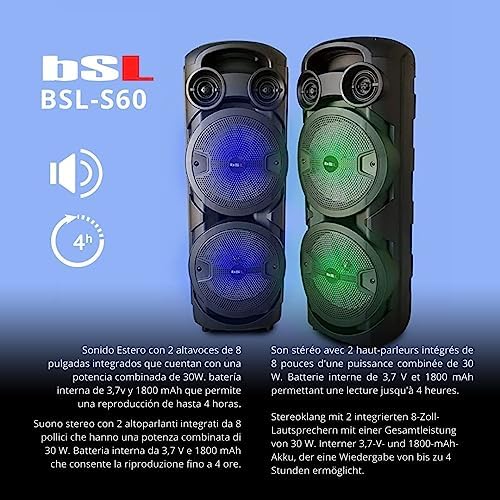 Le Prix Haut-parleur Bluetooth BSL-S60 avec éclairage RVB | 2 haut-parleurs de 8 pouces | 2 x 15 W RMS | Batterie de 4 heures | Fonction karaoké | Radio FM | USB | TF