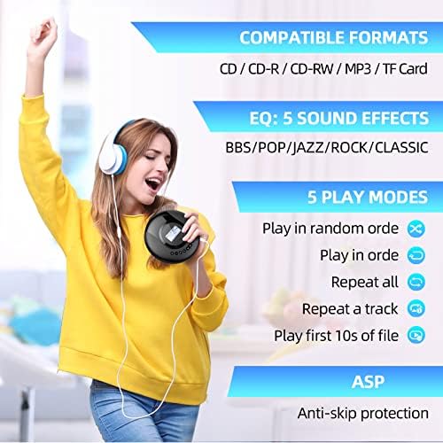 【Lecteur CD portable】 Le lecteur CD portable dispose de deux modes pour la lecture de CD et la lecture de cartes TF. Il existe diverses fonctionnalités modernes. ASP : Protection anti-choc pour éviter que la lecture du CD ne soit interrompue par les vibrations ; 5 effets sonores et 5 fonctions de répétition ; REC : Enregistrez votre voix et vos souvenirs parfaits ; Fonction de lecture programmée