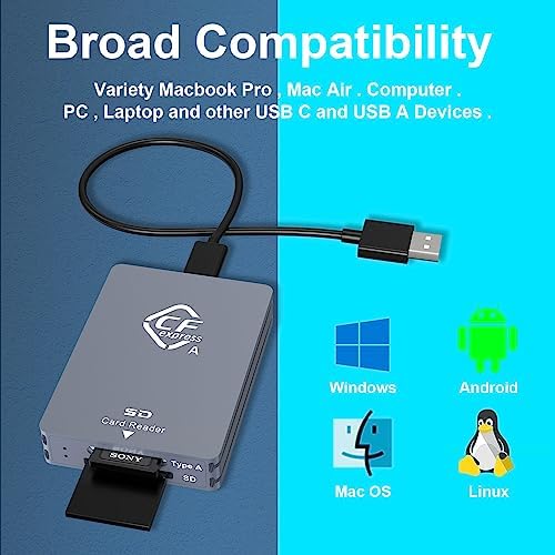 Avis sur Lecteur CFexpress Type A, USB 3.2 Gen 2 10Gpbs,compatible avec CFexpress Type A/SD, lecteur de carte CFexpress portable en aluminium à double emplacement prenant en charge Windows/Android/Mac OS/Linux