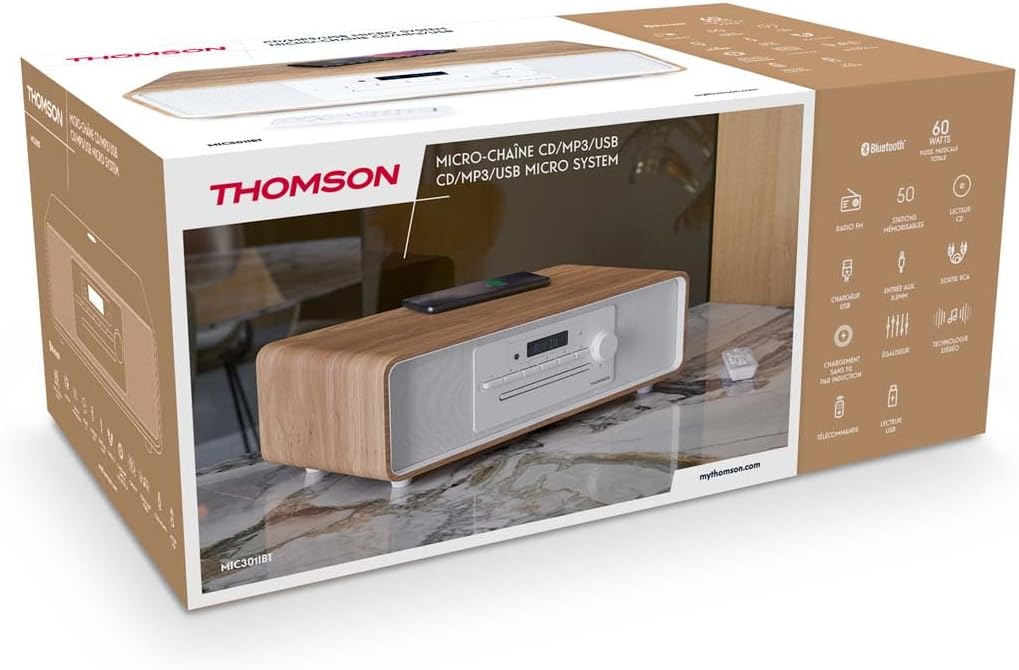 Fiche Technique MIC301IBT Micro Stereo CD Radio FM Radio 50 Preset Stations USB Bluetooth AUX-in + Wireless Charger and USB THOMSON au Maroc