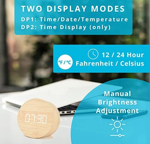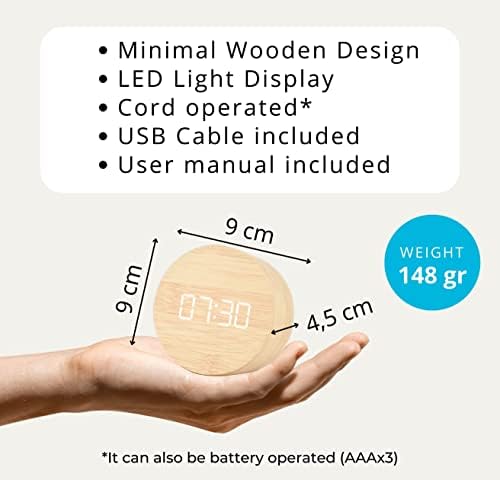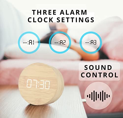 Le Prix MINM Store Réveil pour chambre à coucher, salle de bain | Petite horloge numérique en bois, affichage électronique de l’heure à LED | 3 paramètres d’alarme | Température du calendrier | Fonctionne avec cordon et batterie (bois clair)